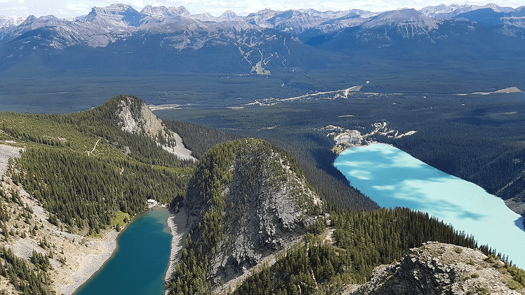 The view from the top of the Thumb is a real landscape firecracker. It cannot be compared to any other views in Banff. At our feet we see Lake Agnes spreading on the left and the otherworldly turquoise Lake Louis on the right. Kayaks and boats resemble moving ants from above. In the distance you can see the glistening windows of Faimont Chateau and the bright lines of the trails diverging from it. This extremely picturesque scenery is complemented by mountain peaks rising in the distance with a green carpet of trees. For this view, it is worth going off the beaten paths and reaching the top of Devil’s Thumb.