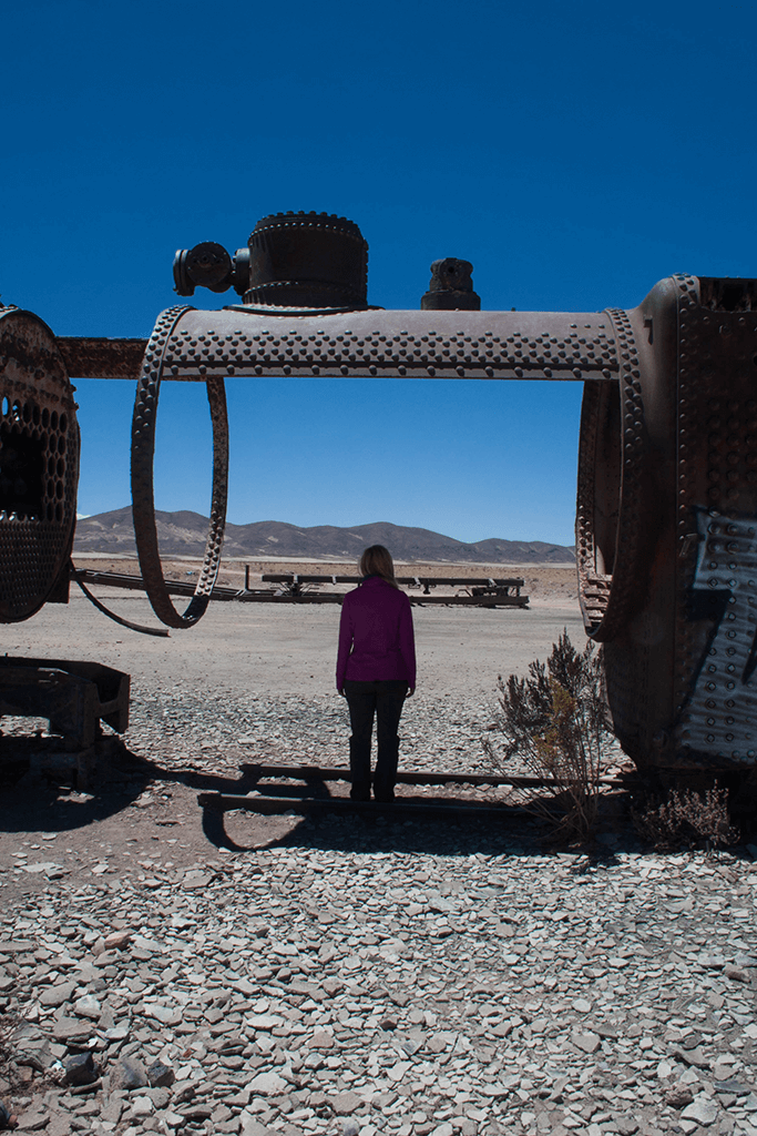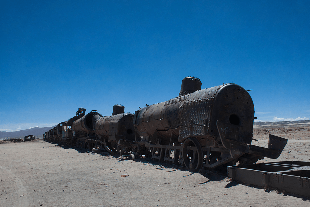 3 km od centrum Uyuni znajduje się cmentarzysko zabytkowych pociągów. Skąd taka atrakcja na solnej pustyni? Miasto w przeszłości było centrum przeładunkowym dla pociągów przewożących minerały z głębi kraju do portów na Pacyfiku. Linie kolejowe zostały zbudowane w XIX w. przez brytyjskich inżynierów. Dzięki rozwojowi transportu miasto miało się bogacić a społeczność Uyuni rozwijać. Jednakże Indianie Aymara byli innego zdania i sabotowali rozbudowę kolei. W efekcie końcowym zasoby minerałów wyczerpały się a wraz z nimi transport. Przedsiębiorstwa, które zamykały swoje zakłady, porzucały pociągi, których wraki stworzyły cmentarzysko.